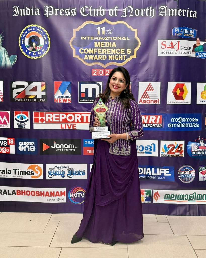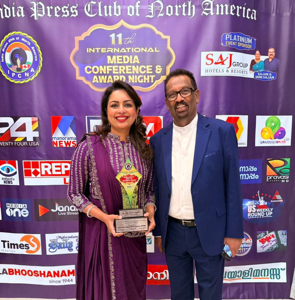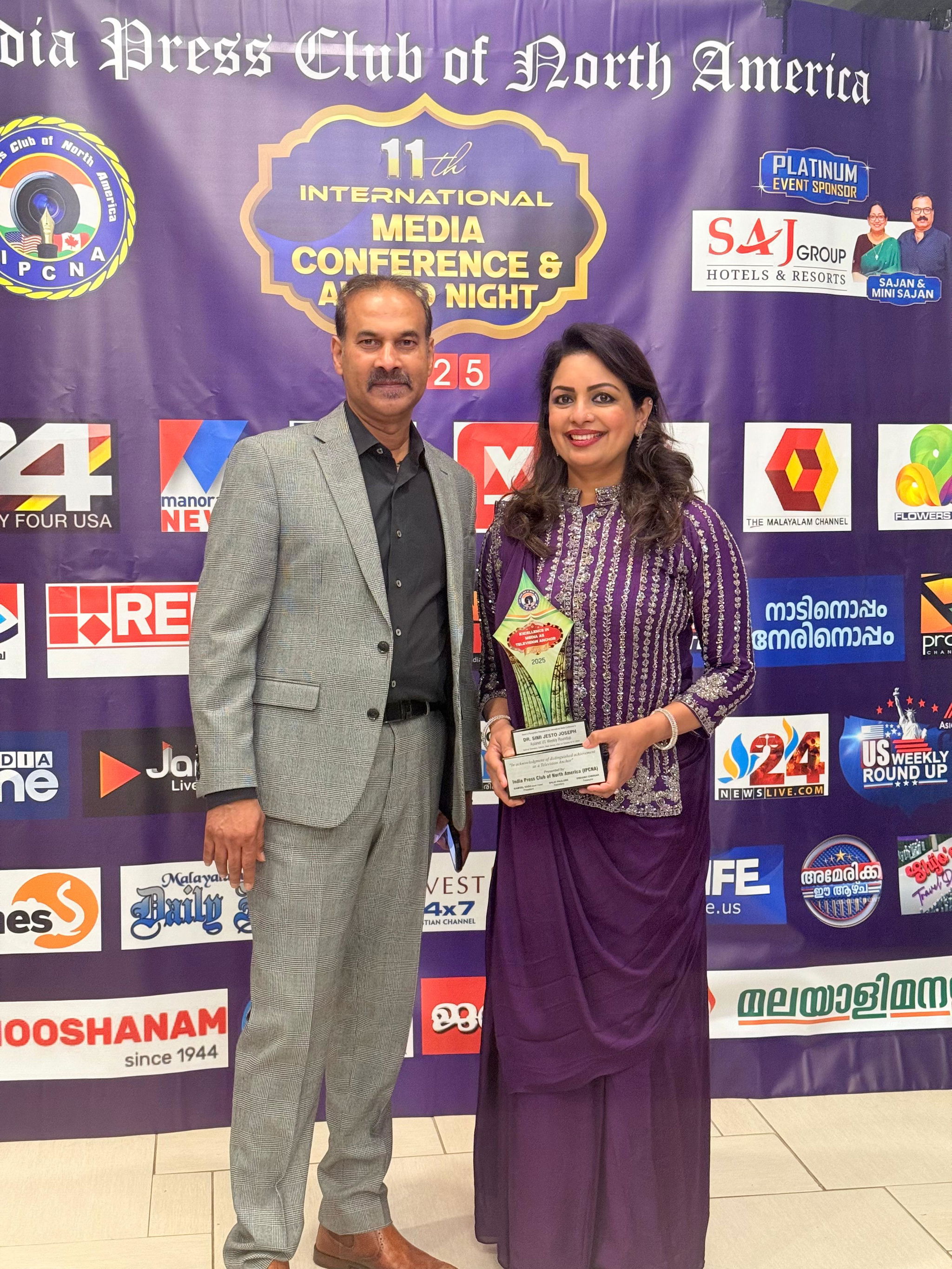 എഡിസൺ, ന്യു ജേഴ്സി: ഡോ. സിമി ജെസ്റ്റോ ജോസഫ് 2025-ലെ ഐ.പി.സി.എൻ.എ (India Press Club of North America) മീഡിയ എക്സലൻസ് അവാർഡ് -ടെലിവിഷൻ ആങ്കറിങ്ങ് വിഭാഗത്തിൽ നേടി. എഡിസൺ ഷെറാട്ടണിൽ നടന്ന ഇന്ത്യ പ്രസ് ക്ലബ് പതിനൊന്നാമത് അന്താരാഷ്ട്ര കോൺഫറൻസിൽ എൻ.കെ. പ്രേമചന്ദ്രൻ എം.പി. അവാർഡ് സമ്മാനിച്ചു.