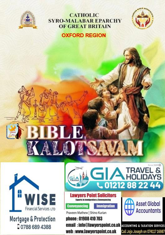 നോര്ത്താംപ്ടണ്: ഗ്രേറ്റ് ബ്രിട്ടന് സീറോമലബാര് എപ്പാര്ക്കി ബൈബിള് അപ്പോസ്റ്റലേറ്റിന്റെ നേതൃത്വത്തില് ഓക്സ്ഫോര്ഡ് റീജണല് ബൈബിള് കലോത്സവ മത്സരങ്ങള് 25 ന്, ശനിയാഴ്ച്ച നടത്തപ്പെടും. നോര്ത്താംപ്റ്റണിലെ കരോളിന് ചിഷോം സ്കൂള് വേദികളില് വെച്ചാവും ആത്മീയതയും, കലാ പ്രതിഭയും സമന്വയിക്കുന്ന വചനോത്സവ കലാ മത്സരങ്ങള് നടക്കുക.