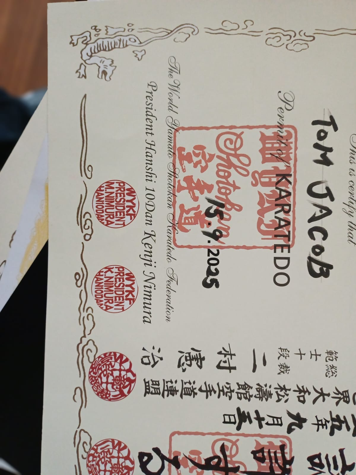 കരാട്ടെ ആയോധന കലയിലെ ഏറ്റവും ഉയര്ന്ന 'ഹാന്ഷി' സീനിയര് മാസ്റ്റര് തിലകം (മോഡല് മാസ്റ്റര് ഓഫ് മാസ്റ്റേഴ്സ്) കരസ്ഥമാക്കിക്കൊണ്ടാണ് ടോം ജപ്പാനില് നിന്നും, ഗ്ളാസ്ഗോയിലേക്കു മടങ്ങുന്നത്. ഷോട്ടോകാന് കരാട്ടെ ആഗോള ചെയര്മാനായ ഗ്രാന്ഡ് മാസ്റ്റര് കെന്ജി നുമ്രയുടെ ( 10th ഡാന് റഡ്ബെല്റ്റ്) കൈകളില് നിന്നും ഈ അംഗീകാരം ഏറ്റുവാങ്ങുവാന് കഴിഞ്ഞത് വലിയ സ്വപ്ന സാക്ഷാല്ക്കരമായി എന്ന് ടോം അഭിമാനപൂര്വ്വം പറഞ്ഞു. 'ഹാന്ഷി' അംഗീകാരം നേടിയ ടോമിന്, കരാട്ടെയിലെ ഏറ്റവും ഉയര്ന്ന റാങ്കായ റെഡ് ബെല്റ്റ് ധരിച്ചു കൊണ്ട് പരിശീലനം നല്കുവാനും കഴിയും.