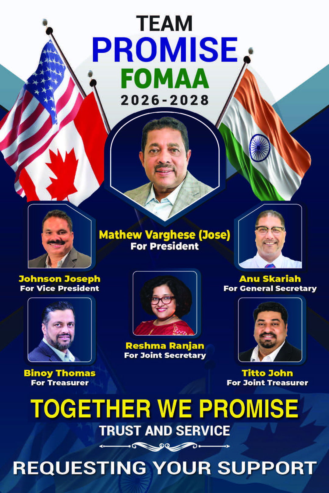 ഇതാദ്യമായി യുവതലമുറക്ക് വലിയ പ്രാധാന്യം നൽകി ഫോമായിൽ മാറ്റത്തിന്റെ കാഹളമായി 'ടീം പ്രോമിസ്.' അവിഭക്ത ഫൊക്കാനയിലും ഫോമയിലും മറ്റു സംഘടനകളിലും ദേശീയ നേതൃത്വത്തിൽ വിജയകരമായി പ്രവർത്തിച്ചിട്ടുള്ള മാത്യു വർഗീസ് (ജോസ്-ഫ്ലോറിഡ) നേതൃത്വം നൽകുന്ന ടീം പ്രോമിസ് പാനലിൽ ജനറൽ സെക്രട്ടറിയായി ഫിലാഡൽഫിയയിൽ നിന്ന് അനു സ്ക്കറിയയും ട്രഷററായി ന്യു യോർക്കിൽ നിന്ന് ബിനോയി തോമസും വൈസ് പ്രസിഡന്ടായി കാലിഫോർണിയയിൽ നിന്ന് ജോൺസൺ ജോസഫും ജോ. സെക്രട്ടറി ആയി ഡാലസിൽ നിന്ന് രേഷ്മാ രഞ്ജനും ജോ. ട്രഷററായി ഫ്ലോറിഡയിൽ നിന്ന് ടിറ്റോ ജോണും മത്സരിക്കുന്നു.