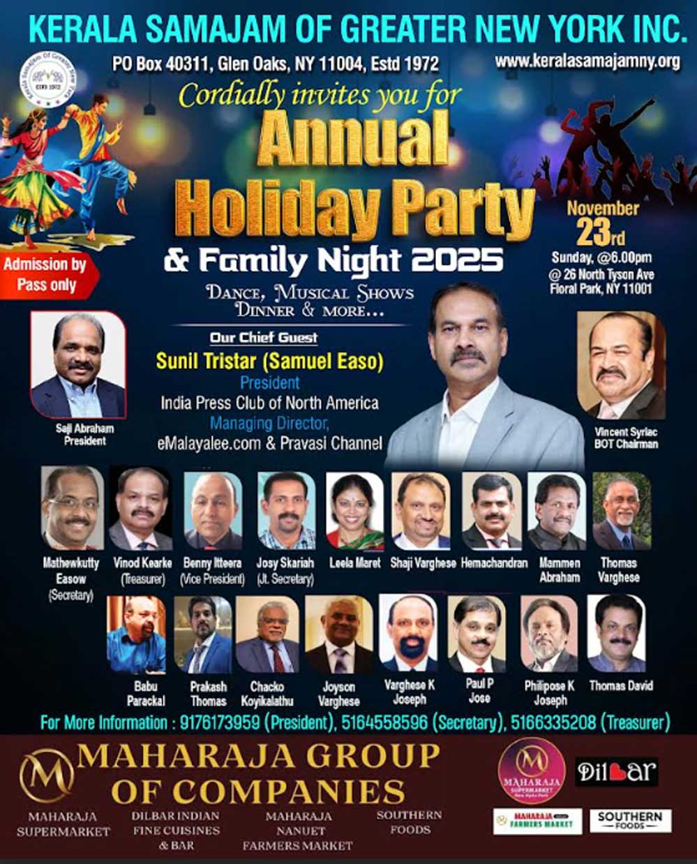 ന്യൂയോർക്ക്: അമേരിക്കയിലെ ഏറ്റവും ആദ്യത്തെ മലയാളീ സംഘടനയായ കേരളാ സമാജം ഓഫ് ഗ്രെയ്റ്റർ ന്യൂയോർക്ക് അതിന്റെ അൻപത്തിമൂന്നാമത് വർഷം വിജയകരമായി പൂർത്തീകരിക്കുന്നതിൻറെ ഭാഗമായി 2025-ലെ വാർഷിക ഡിന്നറും ഫാമിലി നൈറ്റും