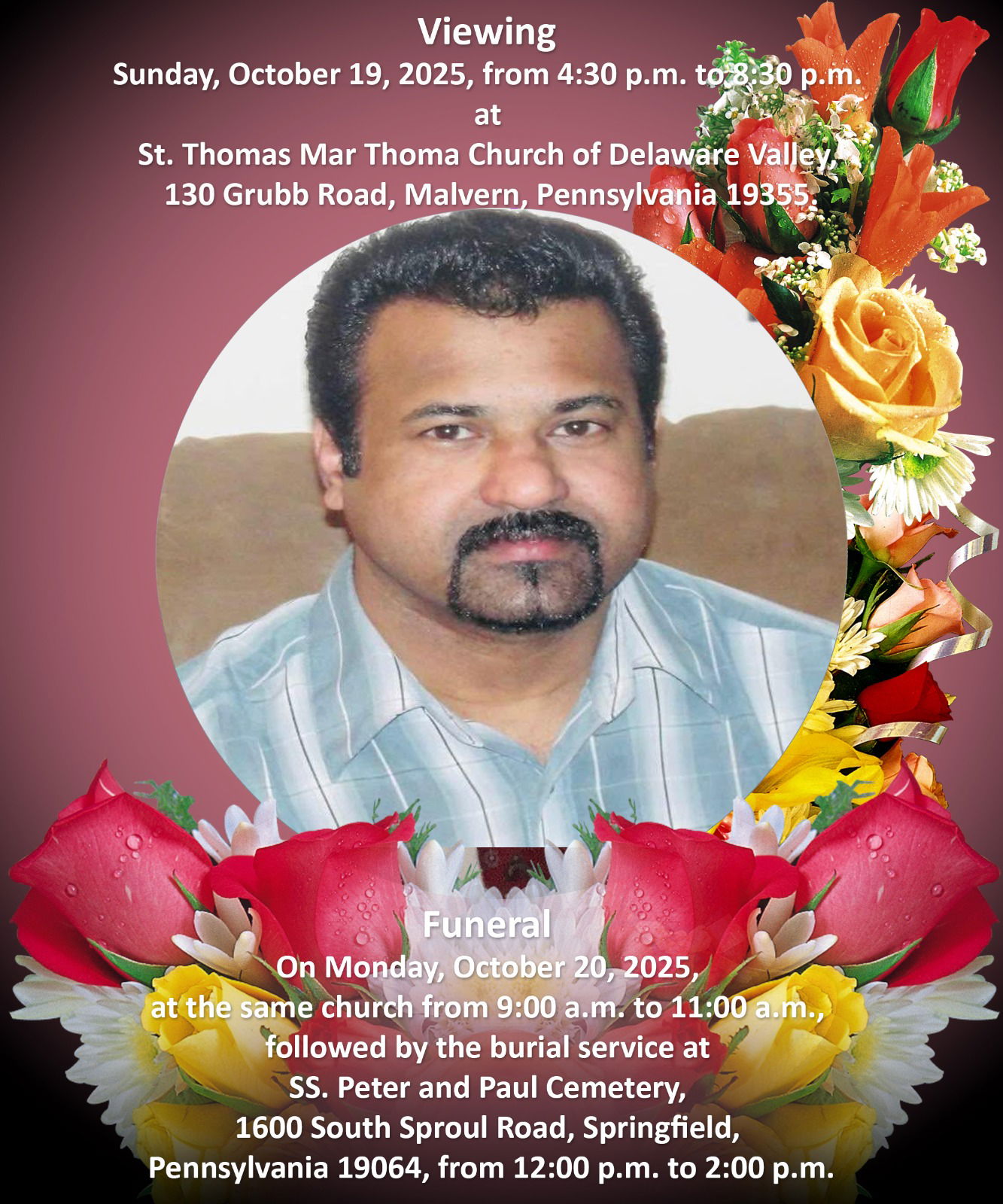 പൊതുദർശനം: ഒക്ടോബർ 19 ഞായറാഴ്ച വൈകുന്നേരം 4:30 മുതൽ രാത്രി 8:30 വരെ: സെന്റ് തോമസ് മാർത്തോമ്മ ചർച്ച ഓഫ് ഡെലവേർ വാലി (130 Grubb Road, Malvern, Pennsylvania 19355.)