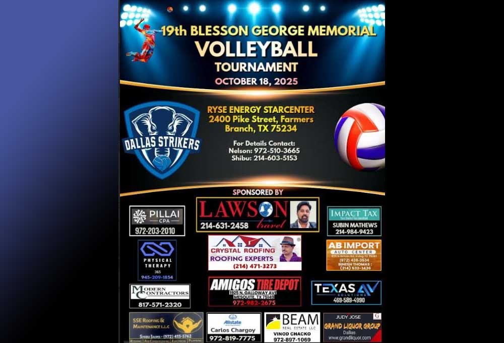 ഫാർമേഴ്സ് ബ്രാഞ്ച്, ടെക്സാസ് : മലയാളി വോളിബോൾ പ്രേമികൾ ആവേശത്തോടെ കാത്തിരിക്കുന്ന 19-ാമത് ബ്ലെസ്സൺ ജോർജ്ജ് മെമ്മോറിയൽ വോളിബോൾ ടൂർണമെൻ്റ് നാളെ (ഒക്ടോബർ 18, 2025, ശനിയാഴ്ച) ഫാർമേഴ്സ് ബ്രാഞ്ചിലെ റൈസ് എനർജി സ്റ്റാർസെന്ററിൽ (2400 Pike Street, Farmers Branch, TX 75234) വെച്ച് നടക്കും.